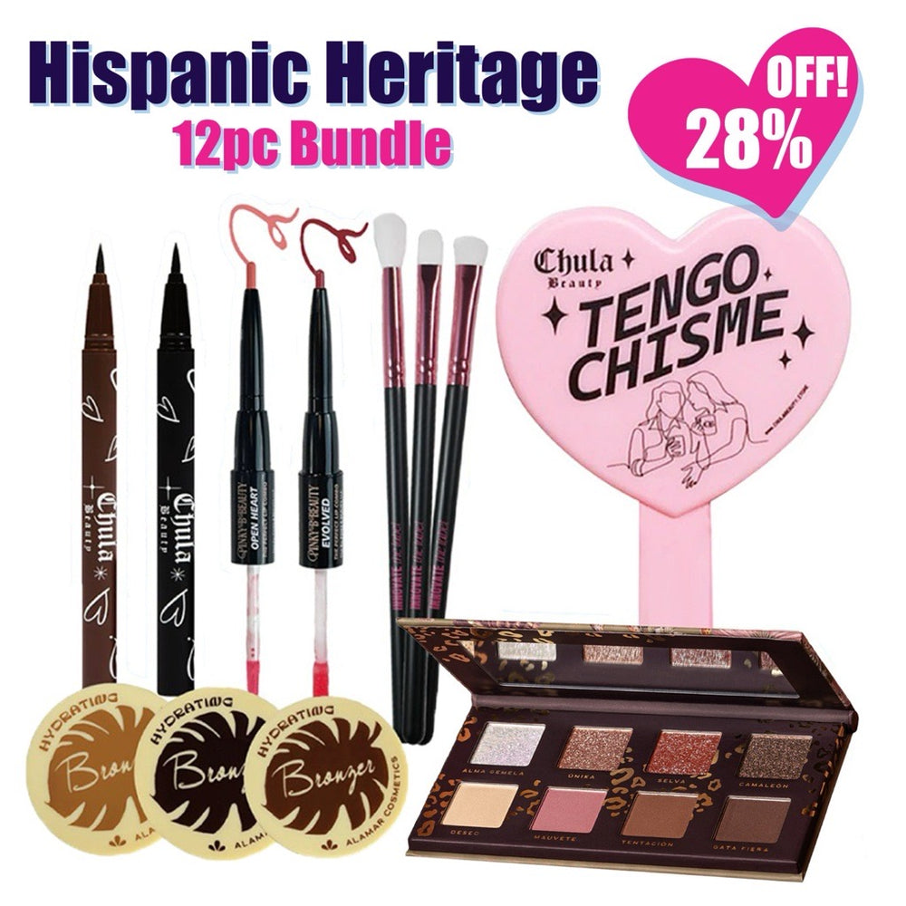 • Más chisme, más glam. The 12 piece Hispanic Heritage Beauty Bundle brings together full size favorites from Chula Beauty, Pinky B Beauty, Innovate The Label, and Alamar Cosmetics. Inside you’ll find everything pictured — eyeliners, bronzers, brushes, a lip gloss with a lip liner on the other end, and the Desnudeas palette — a complete lineup to create endless looks.